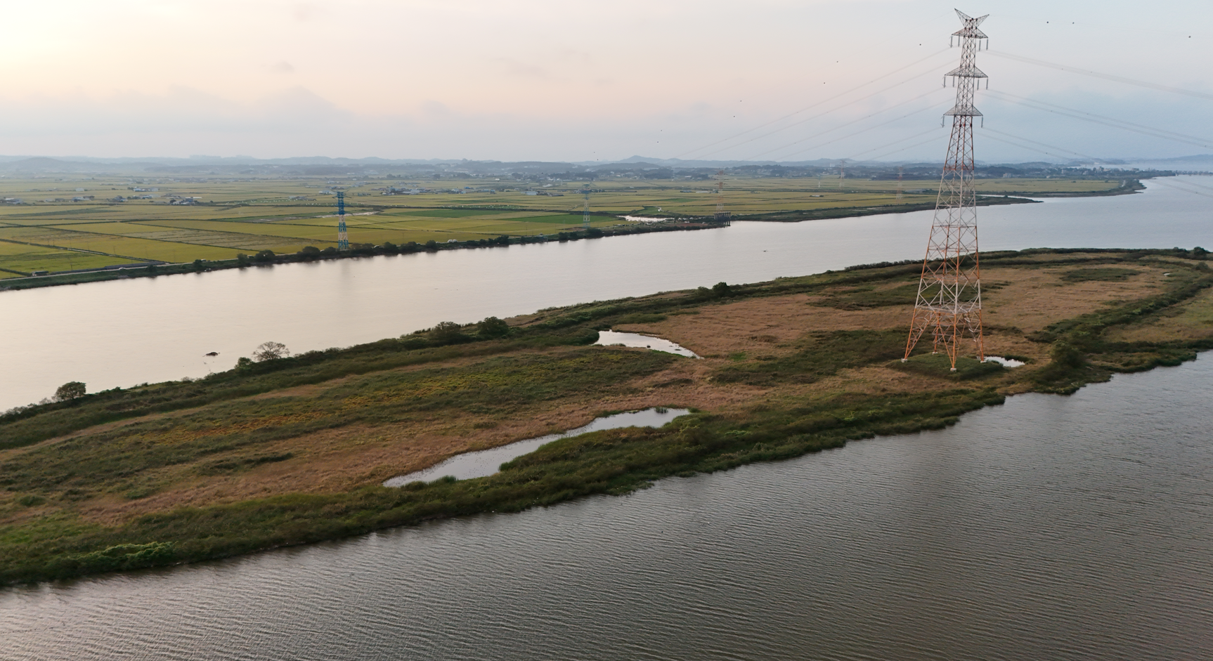 섬처럼 생긴 곳에 송전탑이 세워져 있다.